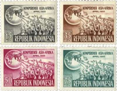 1955年4月18日至22日,印尼万隆举办亚非主要独立国家领导人会议,首次提出了“亚非团结”概念。图中为1955年亚非会议,今称万隆会议的纪念邮票,面值为15、35、50、75印尼分。邮票上特别采用了会议新设计的世界地图,不再如殖民时代以欧洲为中心,而是将通过反殖斗争新近独立的亚非国家置于世界的中心 | 图片来源:bandung60.wordpress.com