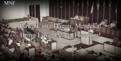1955年印尼万隆举办的亚非会议主题曲《亚非一家》,其中一句歌词是“迎来爱、和平与自由吧!” | 图片来源:油管视频截图