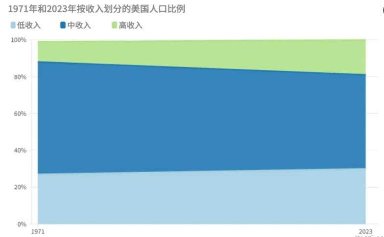比如美国,1971年已经有61%的美国人生活在中产阶级家庭,但到了2023年,这一比例降低到了51%。