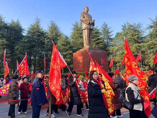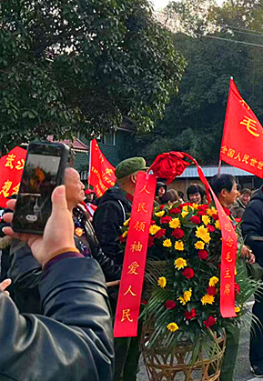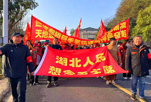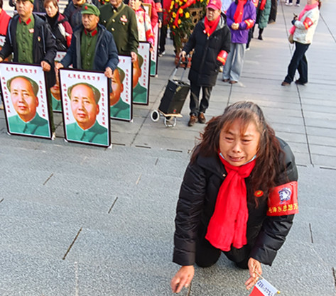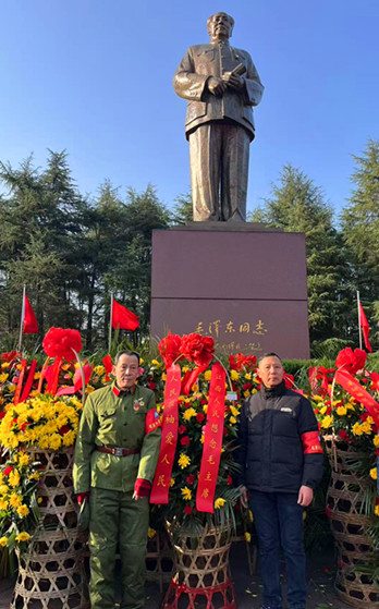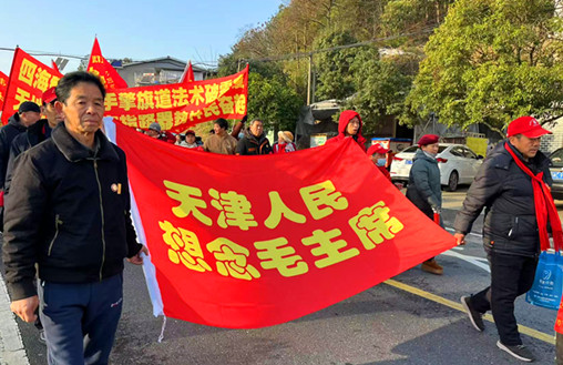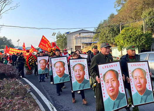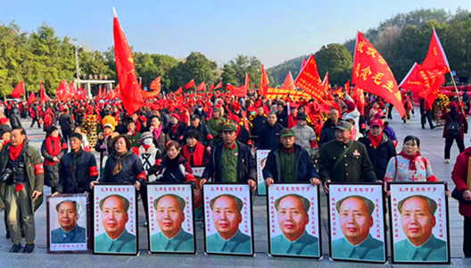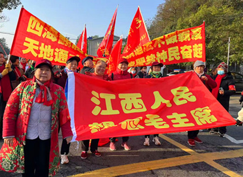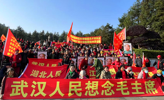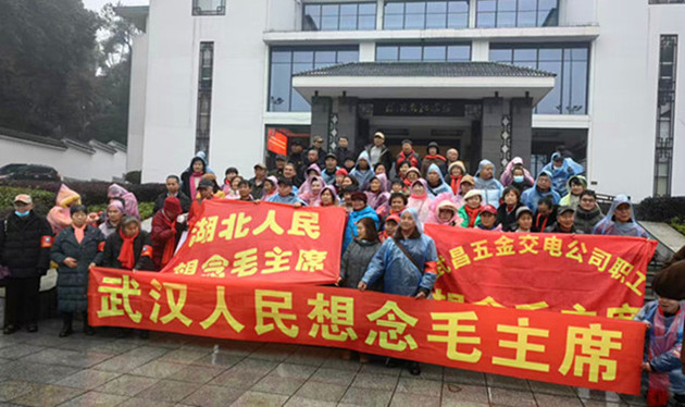 12月25日上午8点,来自湖北(武汉、十堰、荆州)、江西、天津、江苏、上海等地的人民群众,抬着花篮,举着“湖北、江西、天津、武汉人民想念毛主席”,“武汉公交职工想念毛主席”“武昌五金交电公司职工想念毛主席”等旗帜横幅,唱着《东方红》《人民军队忠于党》《社会主义好》《大海航行靠舵手》《国际歌》等,高呼“毛主席万岁!”人民的洪流涌向韶山铜像广场,向毛主席铜像敬献花篮,表达对人民领袖毛主席的爱。