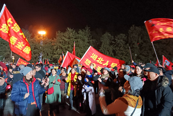12月25日晚,湖北、江西、天津、江苏、上海人民群众来到铜像广场,与全国人民一道为毛主席诞辰132周年守岁,举行联欢。铜像广场人山人海,这是人心民心的展示,我们成为人民汪洋大海的一员而欣慰!人心民心所向,毛主席是人民领袖,毛泽东思想是人民的指路灯,毛主席指引的人民当家作主的社会主义公有制道路,才是中国人民的幸福路强国路!