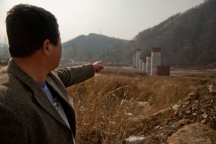 2009年6月,沈阳铁路局对“靖宇至松江河线工程”项目进行公开招标,中国中铁九局集团有限公司中标,随后将这一工程分割为多个标段分包,其中一家江西昌厦建设工程集团公司又将工程包给几个并无资质的农民工队伍。图为工程现场,十几根50米高的桥墩矗立在头道松花江湖畔,现场已看不到任何施工人员。