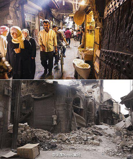 3、Bab Antakya市集,阿勒颇(Aleppo)。上图摄于2009年,下图摄于2012年的一次轰炸之后。