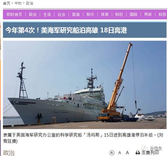 评:新闻背景是,美国海军研究办公室科学研究船汤玛斯号(Thomas G. Thompson (T-AGOR-23)),现正停靠于高雄港9号码头,前“台湾海军新江舰长”吕礼诗稍早在个人脸书揭露此消息。该舰由美国大学暨国家海洋实验室使用,而该实验室隶属美海军科研单位。