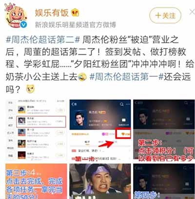 然后这个帖子就被一群微博营销号截图发到微博广为传播。忽然间就掀起了粉丝打榜刷人气大战,所谓的“中老年杰伦迷”一路奋战,周杰伦的超级话题热度,也终于刷到了第一。这时候我们再去找那个发无脑贴的始作俑者,却发现这人一天之内删号消失了。