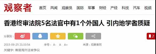 但现在香港的司法系统,绝大部分法官居然是洋人,不是中国人(港人),且法院级别越高,洋人比重越大,这还能说是港人治港吗?至少在司法领域中,目前的现状不是港人治港,而是洋人治港。