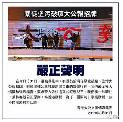 《大公报》招牌被涂污,加上之前《环球时报》记者付国豪机场被围殴,暴徒的针对性非常强,只要不符合“民主斗士”心意的声音一律不得在香港出现。