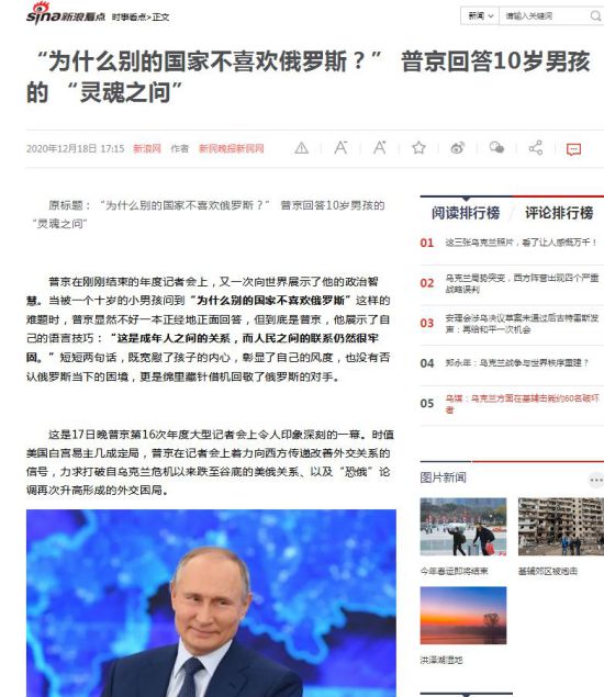 这么重要的消息,居然被漠视了。再搜““为什么别的国家不喜欢俄罗斯?” 普京回答10岁男孩的 “灵魂之问””,环球网上有,点进去看,也被轻描淡写了。