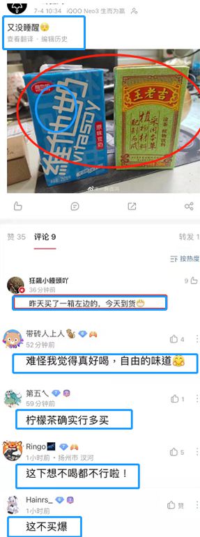 以公知又坏又怂的个性,指望公知明说支持维他奶肯定是不现实的,但这并不妨碍公知“曲线救维(他奶)”。“维他奶事件”后,有人就一大早发了个维他奶的图片,但文字是“又没睡醒”,大公知这么说了,小公知岂有不秒懂之理,“昨天买了一箱左边的(维他奶),今天到货”“难怪我觉得真好喝,自由的味道”“柠檬茶确实行多买”“这下想不喝都不行啦”“这不买爆”……