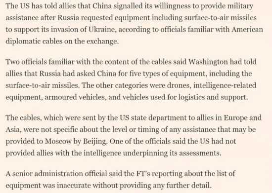 文章引述美国两名知情官员的话称,美国国务院已通知北约组织成员国和亚洲盟友,宣称“中国已表示愿意对俄罗斯提供军事支援”。而且,美国国务院还通过外交电报告诉盟友,“中国会否认这种计划的存在”。