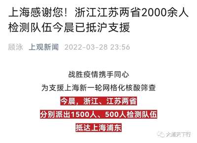 江浙紧急驰援上海。浙江省3月27日晚迅速集结50辆大巴,于28日4点30分出发,7点30分到达上海浦东。江苏省也抽调核酸采样500余人,连夜驰援上海,并于3月28日晨抵达上海浦东。