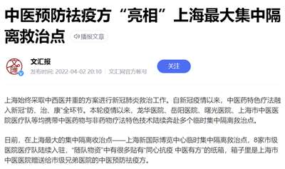 就在朱主任电话录音广泛传播的当天,上海《文汇报》就报道了中医药在隔离收治点全力提供救治的情况,与朱主任说的截然相反。在朱主任看来,大约中医这么多品种、分类施治的预防祛疫方治疗都算是“没啥治疗”,“太极拳、八段锦”就更是没啥治疗了。