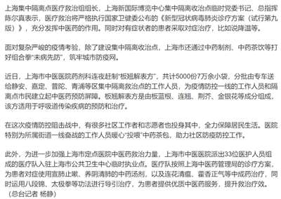 即便是西医主导的瑞金医院、华山医院也组建了中医医师和西医医师共同参与的医疗团队,全程开展中西医联合查房、会诊,并根据患者病情采取中西药并用的策略,第一时间将预防方送到患者手中。