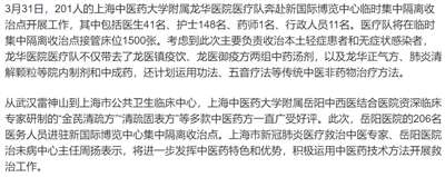 自3月1日以来,上海中医药大学附属曙光医院、上海中医药大学附属岳阳中西医结合医院和上海市中医医院3支中医医疗队,已经在第一时间快速进入病区收治患者。