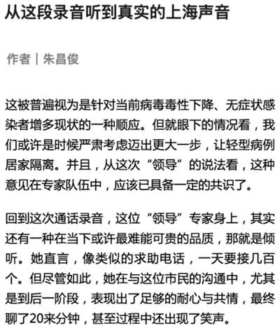 4月2日,共存派的自媒体接力传播一段上海浦东疾控中心朱主任与“群众”对话的通话录音,《光明日报》专栏作者朱昌俊将这段录音吹捧成所谓的“上海共识”,接着就是各路魑魅魍魉的狂欢与表演。