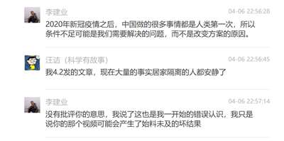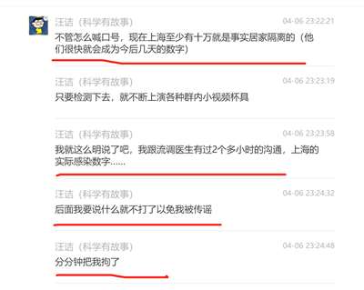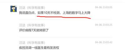 从上面的对话可以看出,汪老师一直不认为他有错,不认为他那篇与防疫政策相违背的采访录音和文章导致了上海居民思想的混乱,他说“这是既成事实”,同时,他再次展示了他的“科学精神”,放出了“只要停止检测,10天后上海的数字马上下降”这样的神论。
