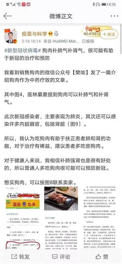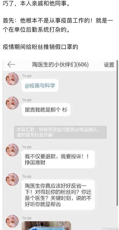 我那篇文章主要是为了告诉大家,这个“陶医生”名不副实,2017年因为造谣国家疫苗计划早就离开了疾控中心,现在主要的工作就是搞“科普自媒体”,微博网名叫做“疫苗与科学”,和搞“科学有故事”的汪诘是同行;陶黎纳在互联网上可以说是劣迹斑斑,经常发表一些伪科学和谣言,比如说“狗肉抗新冠”,他造的最大谣言,就是“国产疫苗全球最不安全”,还被西方媒体各种转载,说他“遭到封杀”。他还在疫情期间贩卖过假口罩,被自己的粉丝揭穿。