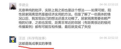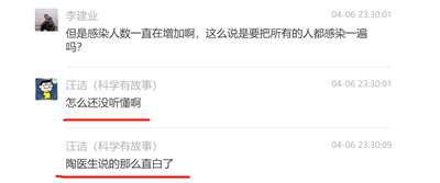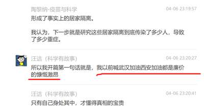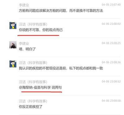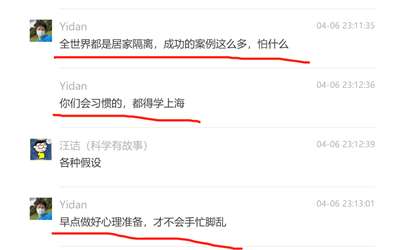 他们在某个科普群里,和网友有一段长达数十页的对话,主要讨论的就是“开放共存”、“防疫无意义”、“不检测,10天疫情就结束”。事情的开端是有一位网友质问“汪老师”,说他那篇采访爆文鼓吹“居家隔离”,误导了上海人民,给防疫制造了更大的苦难......“汪老师”不服,于是开始了长达一个多小时的“辩论”,其间汪诘还直接@陶黎纳帮腔助战,看来他俩的关系不一般.,还有一个他俩的拥护者Yidan,公然喊出“你们会习惯的,都得学上海”......全文太长,我截取几个重要片段,大家围观学习一下,主要学习一下自称“科普工作者”们“专业”、“科学”、信口雌黄、指鹿为马、不服责任的技巧。免得以后遇到这种人,轻易就被他们忽悠了。