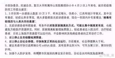 同期,不规范写作先生的同事代表张小丰称,“病.毒有较强烈与人类共存的意愿”,建议有条件的采取居家隔离方式,并停止全员核酸检测筛查,与此同时,尽快引进辉瑞公司的mRNA yi.苗。