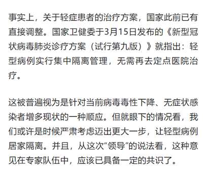 当日,当地新国际博览中心方舱医院总指挥陈尔真在接受采访时称,如果无症状量太多,有条件可以居家隔离。