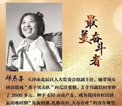 邢燕子,1958年响应党中央号召,到天津宝坻当了农民。后来在全国粮食危机时,成为当地一名劳动能手,成立了“邢燕子突击队”,人民日报专门发表介绍邢燕子的长篇通讯,身为人大副委员长的郭沫若,亲笔创作了《邢燕子歌》。她5次受到毛主席接见,13次受到周总理接见,从党的九大到十三大,她都是党代会代表。2009年,她当选100位感动中国人物之一。