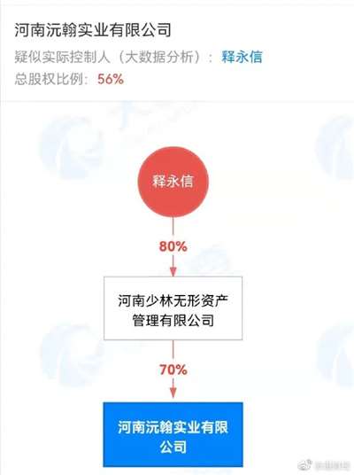 天眼查信息显示,释永信目前对18家企业拥有实际控制权,如河南嵩顶文化旅游发展有限公司、河南少林无形资产管理有限公司、河南嵩山少林寺茶叶有限公司等。