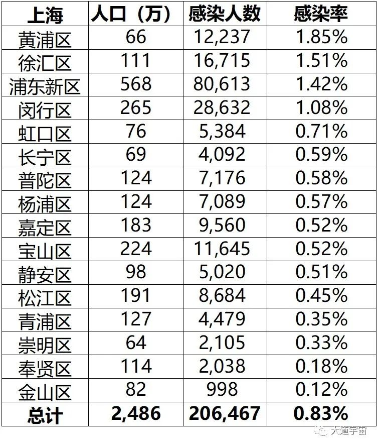感染人数最多的是浦东新区,超过8万。但是按感染率看黄浦区最严重,1.85%的人口被感染,徐汇区其次1.51%,浦东第三1.42%。