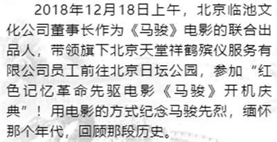 这家文化公司一出手就是大动作,在2018年底投资了一部红色电影,名为《马骏》(后来应改名为《青春之骏》)。