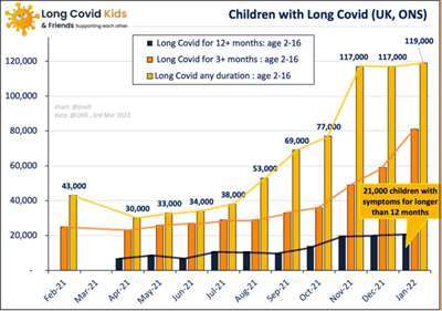 还是英国国家统计署的数据,截止2021年12月底,英国已经积累1.1%的小学学龄儿童,出现“日常生活受到严重影响”的新冠后遗症。