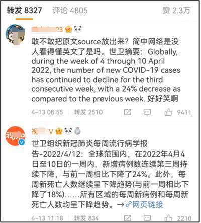 所以,最早拿世卫组织报告里另外一段话,来指责官媒乱翻译的人,大概率是别有用心的。