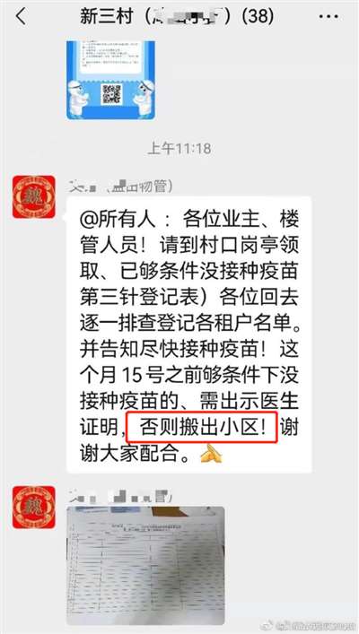前文提到的博主还贴出了深圳某村物业管理人员的通知,强硬地要求“这个月15号之前够条件下没接种YM的,需出示医生证明,否则搬出小区!”