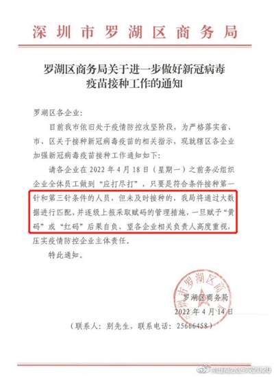 罗湖区的那份文件则要求辖区内各企业在2022年4月18日前务必组织企业全体员工做到“应打尽打”,只要是符合条件接种第一针和第三针条件的人员,但未及时接种的,将通过大数据匹配并逐级上报采取赋码的管理措施。这也就能解释为什么会出现“不打YM,你将被赋黄码”的横幅了。这个横幅已经在深圳多个市区都出现了。