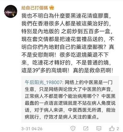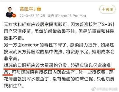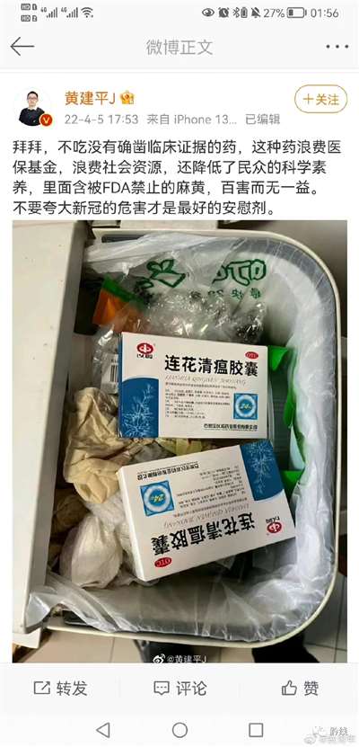 “连花清瘟”只是一款老药,新冠疫情之前就用于治疗感冒引起的咳嗽、头痛、发烧等症状,新冠疫情后也用了两年多了......如果有什么问题,你早不讲,晚不讲,偏偏在引进2300元一盒的“辉瑞神药”的时候跳出来炒作,真的很有意思。