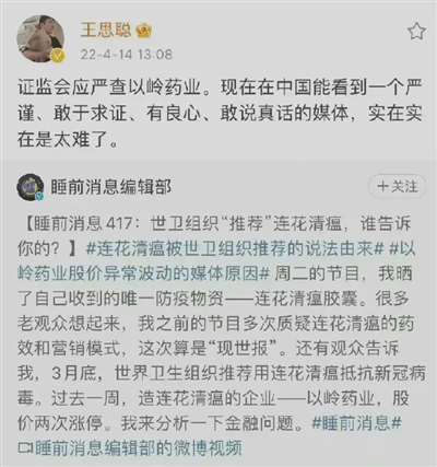 但最近的态势明显比较诡异,先是自媒体“睡前消息”点名,再是王思聪裹挟流量攻击,然后是“丁香医生”定点轰炸,媒体人、资本家、“专业人士”联合起来了,目标是一款一盒十几块的中成药,这就比较邪乎。