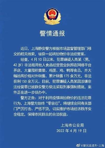 最新公布的一个案件显示,4月10日以来,犯罪嫌疑人高某(男,42岁)非法租用他人食品经营营业执照在网络平台开店,大量囤积青菜、鸡蛋、鸡、鸭等食品,并大幅抬高价格对外销售,累计销售175余万元,非法获利150余万元。目前,犯罪嫌疑人高某因涉嫌非法经营罪已被静安警方依法采取刑事强制措施。成本25万元,利润150万元,利润率高达6倍!