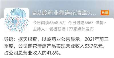 昨日,“老板联播”又在微博上发起新一轮攻势,再次将“连花清瘟胶囊”顶上热搜。在“老板联播”发起的讨论中,多家媒体共同发布消息称“以岭药业公告显示,2021年前三个季度,公司连花清瘟胶囊产品实现营收33.7亿元,占公司总营收的41.6”。