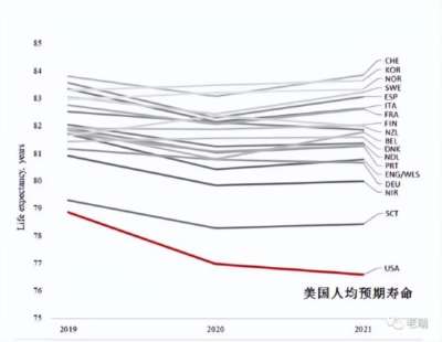 最近的一份研究结果表明,2021年美国人均预期寿命在2020年下降1.87岁到76.99岁的基础上,连续第二年再降0.40岁,到了76.60岁,两年累积下降了2.26岁。超额死了那么多人,竟然还不影响这个国家的整体寿命,这是小学生都说不出来的话。随着新冠导致各种怪病的蔓延,我相信美国今年的预期寿命还要继续降低。
