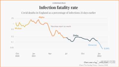 英国年初就放弃了所有防疫措施,彻底躺平了。理由是,现在的奥密克戎病死率已经非常的低,所以没必要那么严防死守了,如下图所示: