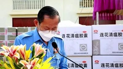 柬埔寨矿产与能源部部长隋森(Suy Sem)在菩萨省省长乔泰(Cheav Tay)的陪同下到菩萨省威荣区慰问当地民众,并向现场的600个家庭发放了连花清瘟胶囊。图为政府官员代表在活动现场发言。