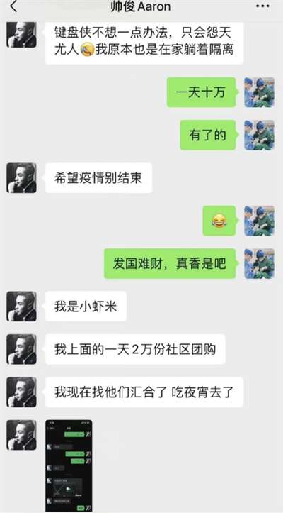 博主@填鸭式教育受害者曝出聊天记录,上海竟然真的有人在发国难财,一天赚一万的那都是小虾米,稍微上点档次的领导,就是一天三十万起步。