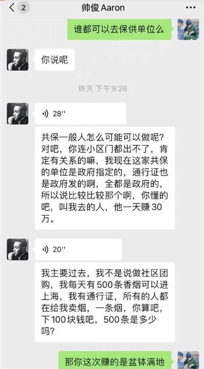 有人敢如此光明正大的曝光,甚至曝出相关信息,我想这事情99%是真实的。这也非常清晰的解释了以上那些网友们存在的疑问,为什么上海要把援助的菜丢掉?为什么不接收支援上海的菜?这位帅俊已经说得很清楚:一条一两百的烟,只有他有通行证,就只有他拿得到货,卖出去价格直接翻倍,自己就要赚一两百,就这,想买烟的人也得抢。