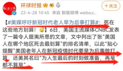 最近,新冠疫情的死亡病例大多是老年人的说法很“流行”。美国主流媒体CNBC甚至“贴心”的建议“新冠时代老人早为后事打算”“为人生最后的时刻做准备,再早都不算早”,我不知道CNBC这话的矛头是不是指向拜登和佩洛西的,但这种对老年人的生死麻木不仁的态度还是让人细思极恐,这就是公知所说的美国式的“岁月静好”?