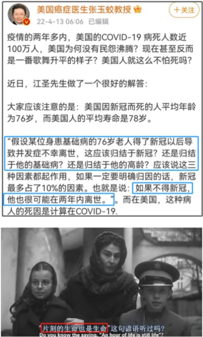 还有人说,“假设某位身患基础病的76岁老人得了新冠以后导致并发症并不幸离世,这应该归结于新冠?还是归结于他的基础病?还是归结于他的高龄?”“如果不得新冠,他也很可能在两年内离世”,两年的生命在此人的口中竟如此轻描淡写,难道此人没听说过“片刻的生命也是生命”的说法吗?
