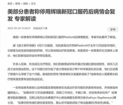 最近几周,出现了许多服用辉瑞新冠口服药Paxlovid反弹的报道,即一些新冠患者在完成规定的Paxlovid治疗5天疗程后,新冠肺炎的症状再次出现。