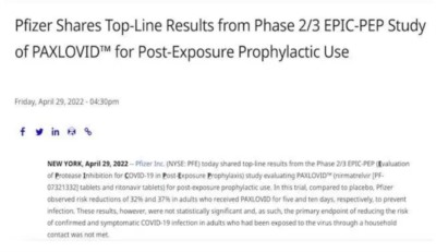 4月29日,辉瑞在其官网发布了一项研究其口服新冠药Paxlovid用于暴露后预防的II/III期临床(EPIC-PEP)研究情况,结果显示该药用于成人暴露后预防效果不佳。也就是说,该药不能用于暴露后预防。