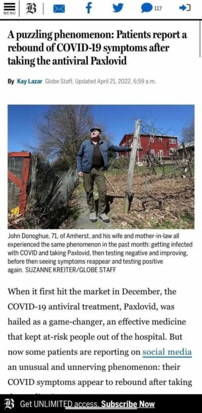 一个具体的案例,来自VA波士顿医疗保健系统研究人员的报告:一名71岁的男子已经完成了加强针接种,他在新冠检测呈阳性的那天便服用了Paxlovid。2天后,他感觉好多了,并在大约一周内没有出现任何症状。但第9天时,他的症状又出现了,直到第12天才完全消退。基因测序显示,导致最初感染的同一种新冠病毒已经成倍增加并卷土重来。