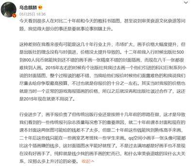 乌合麒麟以二十年前传统出版行业给画手的出价和现在对比,认为出版社在出价上没有与时俱进,所以导致插画水平差,让大家都别讨论那么多有的没的。