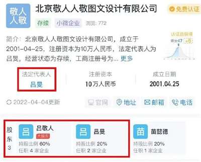 “北京敬人人敬图文设计有限公司”的法定代表人是吕旻,还有个股东是吕敬人。