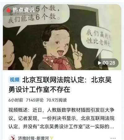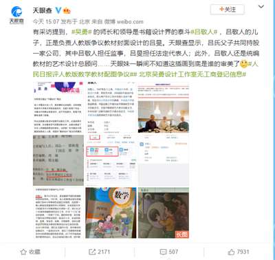昨天下午,@天眼查 发布消息,称:#吴勇# 的师长和领导是书籍设计界的泰斗#吕敬人# ,吕敬人的儿子,正是负责人教版争议教材封面设计的吕旻。天眼查显示,吕氏父子共同持股一家公司,其中吕敬人担任监事,吕旻担任法定代表人;此外,吕敬人还是统编教材的艺术设计总顾问……天眼妹一瞬间不知道这插画到底是谁的审美了