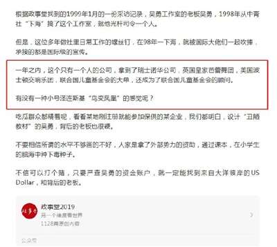 该自媒体还指出:人家是拿了外部势力的资助,通过课本在小学生的脑海里种下毒种子。只要严查吴勇的资金账户,就一定能找到来自大湾大洋彼岸的Us dollar和背后的老板。